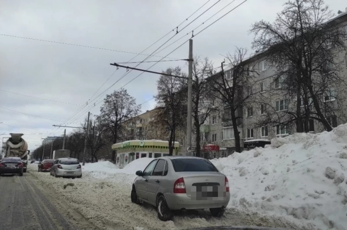 И она частично завалена снегом. Средняя полоса используется для парковки транспортных средств, которым, видимо, не хватило места во дворах. На крайней правой тоже паркуют авто. Эти полосы также завалены снегом.