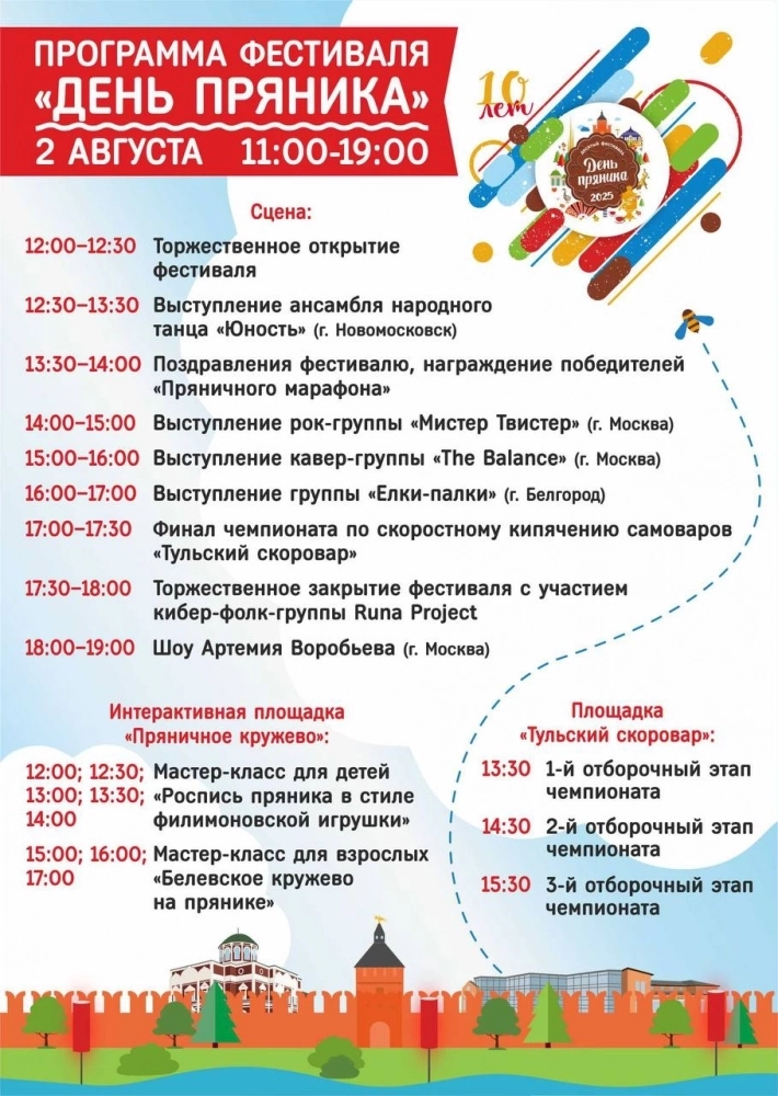 На площадке «Тульская кадриль» можно выучить движения старинного танца, узнать, почему он популярен. На площадке «Пряничное кружево» заработают выставки «Кружевокружение» и «Живые картины». Организуют мастер-классы для детей и взрослых по росписи пряников в стиле белёвского кружева и филимоновской игрушки. Пройдут соревнования «Тульский скоровар». Участники попробуют себя в растопке самоваров.
