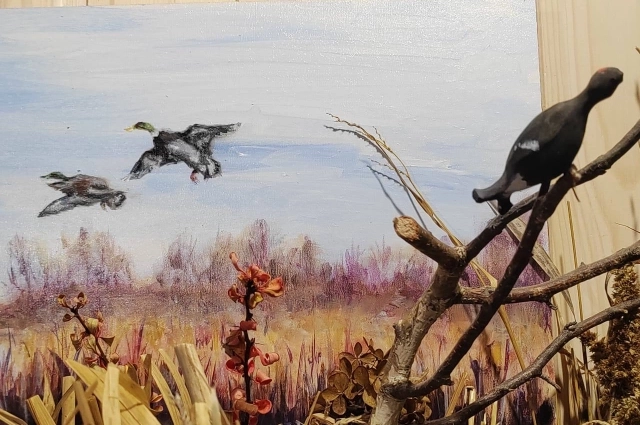 Работу почистили и подкрасили, добавили туда сову в дупле, взлетающих уток из лёгкого пластилина. Ольга написала осеннюю картину, которую разместили на заднем плане.