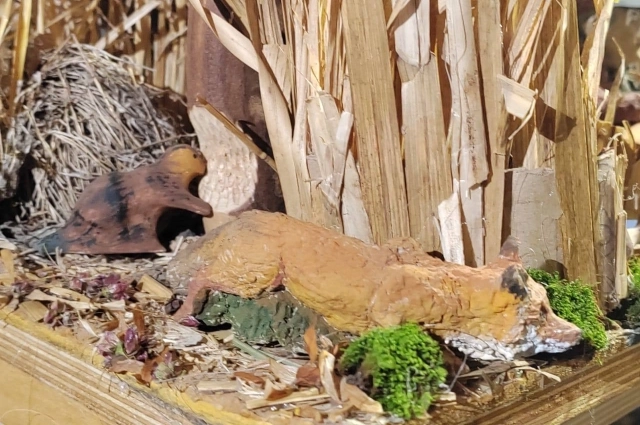 Он сделал весь антураж, использовал камыш, веточки, мох. Ружья, уток, вёсла, котелок, бобра ,удочку, щуку и тетерева вырезал из дерева. Потом появились лиса и кабан, лодка. Семья раскрасила макет раскрасили и поставила у себя в прихожей.