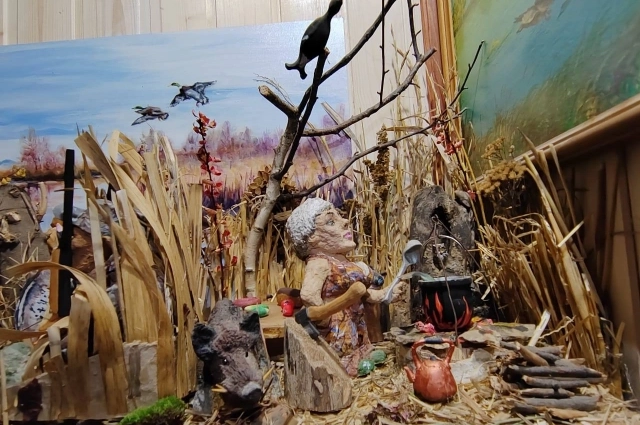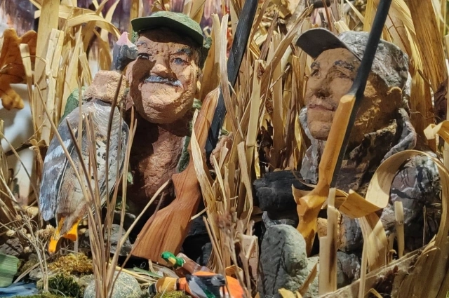 «Три года назад у меня появилась идея сделать маленький макет - фрагмент охоты на уток. Я тогда ещё охотился. Ольга поддержала. Чтобы скоротать зиму, мы занимались созданием композиции два с половиной месяца. Моя жена - хороший художник, и все персонажи, а они реальные, получились очень похожими. Фигурки охотников и самой Ольги выполнены из папье-маше», - рассказал Владимир.