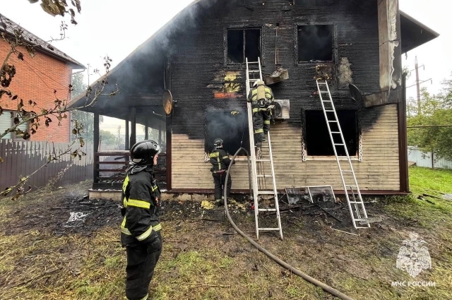 Двухэтажный дом с чердаком и верандой, большие окна, из которых валит чёрный дым. Пожарные работают на месте страшных событий. Здесь умер семилетний ребёнок — стал жертвой возгорания.