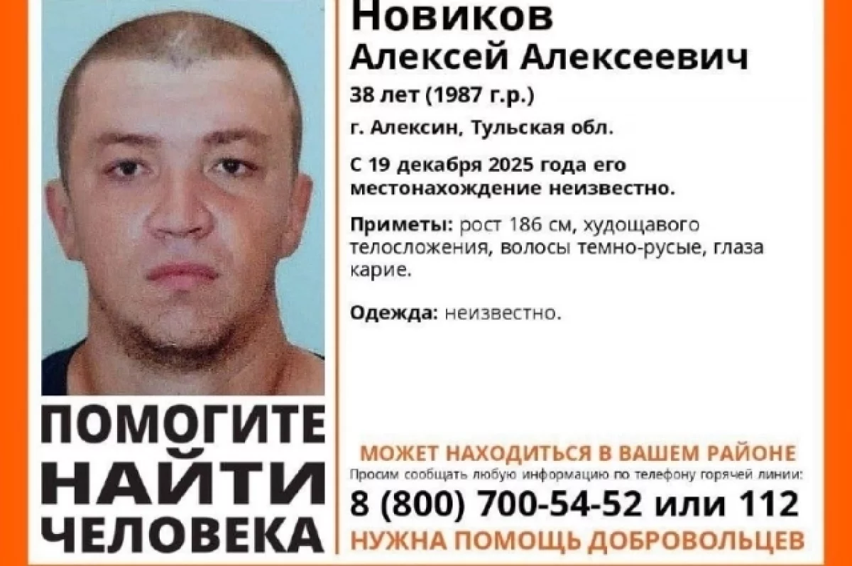 В Алексине пропал 38-летний Алексей Новиков. Об этом информирует поисковый отряд «ЛизаАлерт». Местонахождение мужчины неизвестно с 19 декабря.