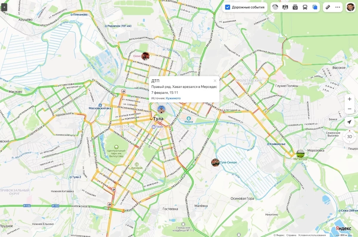В течение дня 7 февраля в разных частях Тулы происходят дорожно-транспортные происшествия на фоне очередного снегопада. Об этом свидетельствуют данные сервиса Яндекс Пробки. При этом загруженность дорог города по версии сервиса 2ГИС с самого утра составляет 6 баллов.