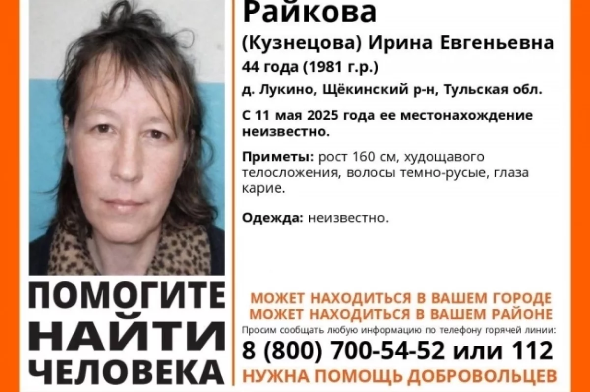 В деревне Лукино Щёкинского района пропала Ирина Райкова (Кузнецова). Об этом сообщает поисковый отряд «ЛизаАлерт». Местонахождение 44-летней женщины неизвестно с 11 мая.