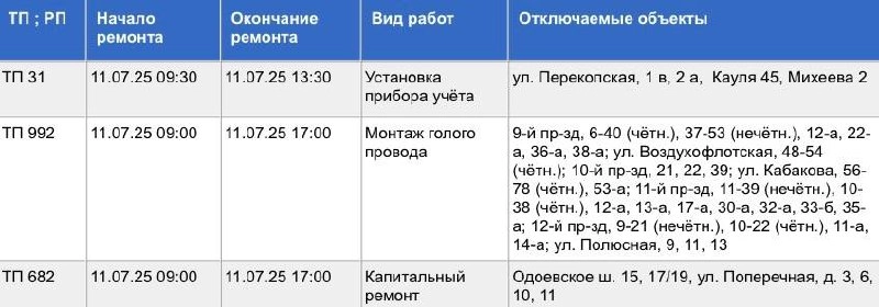 Пройдут плановые работы по монтажу голого провода, установке прибора учёта и капитальному ремонту. Света не будет с 09.00 и 09.30 до 13.30 и 17.00, в зависимости от адреса.