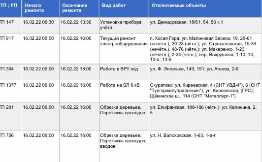 В Туле 16 февраля по ряду адресов отключат свет.