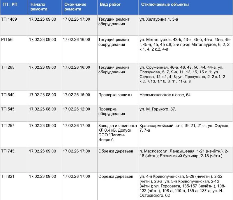 Пройдут плановые работы по обрезке деревьев, проверке оборудования, текущему ремонту оборудования и др.