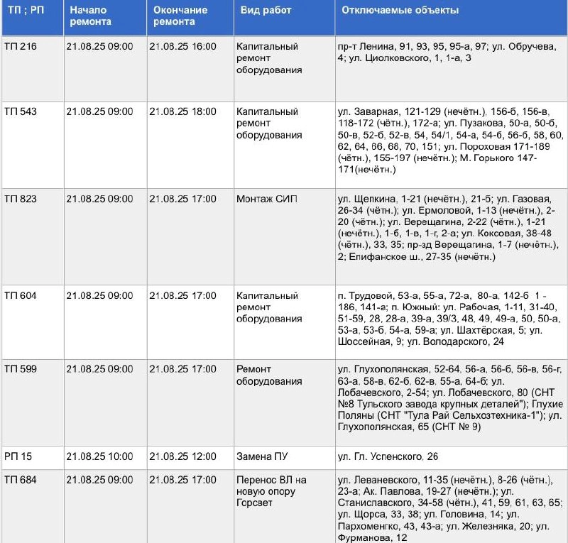 В Туле 21 августа по ряду адресов отключат свет. Об этом информируют «Тульские городские электрические сети».