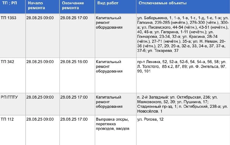 Запланированы работы по капитальному ремонту оборудования, выправке опоры, перетяжке проводов, вводов. Отключения ожидаются с 09.00 до 16.00 и 17.00.