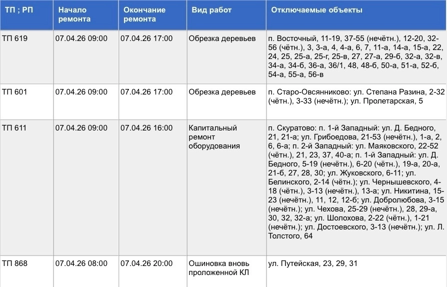 Запланированы работы по обрезке деревьев, капитальному ремонту оборудования и др. Света не будет с 08.00 и 09.00, в зависимости от адреса.