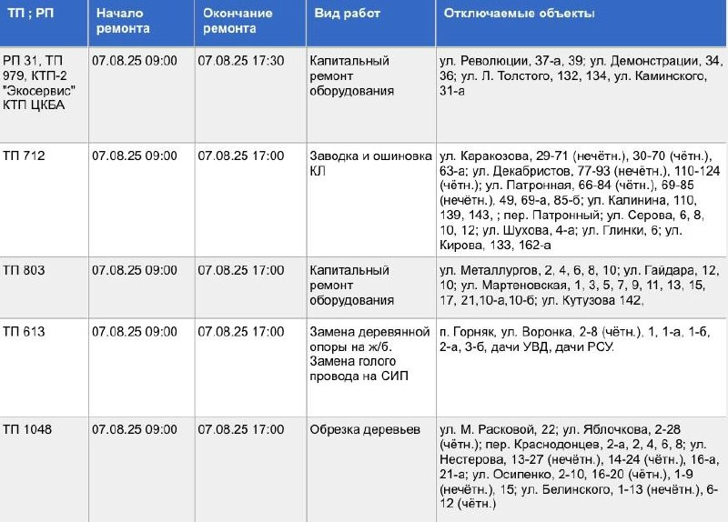 Планируются работы по капитальному ремонту оборудования, обрезке деревьев и др.