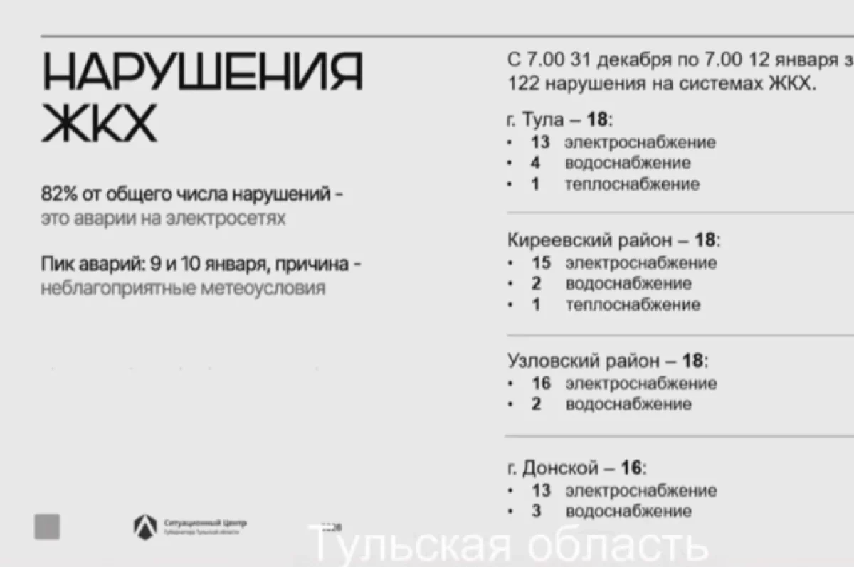 При этом 82% от общего числа нарушений — аварии на электросетях. Их пик аварий пришёлся на 9 и 10 января и был вызван неблагоприятными метеоусловиями. Оперативно восстановительные работы проводились в Венёвском, Арсеньевском, Кимовском районах, Туле и Славном. Наиболее длительные сроки восстановления (сутки и более) зафиксированы в Чернском, Узловском районах, Донском и Новомосковске. Также названы муниципалитеты, в которых за период праздников не произошло ни одного нарушения ни по одному из видов ресурсов: Заокский, Тёпло-Огарёвский, Куркинский, Каменский районы, Ефремов и Новогуровский.