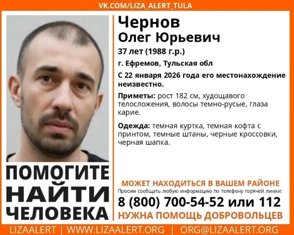 В Тульской области ищут Олега Юрьевича – мужчину 37 лет, пропавшего 22 января. Поиск ведут добровольцы отряда «ЛизаАлерт».