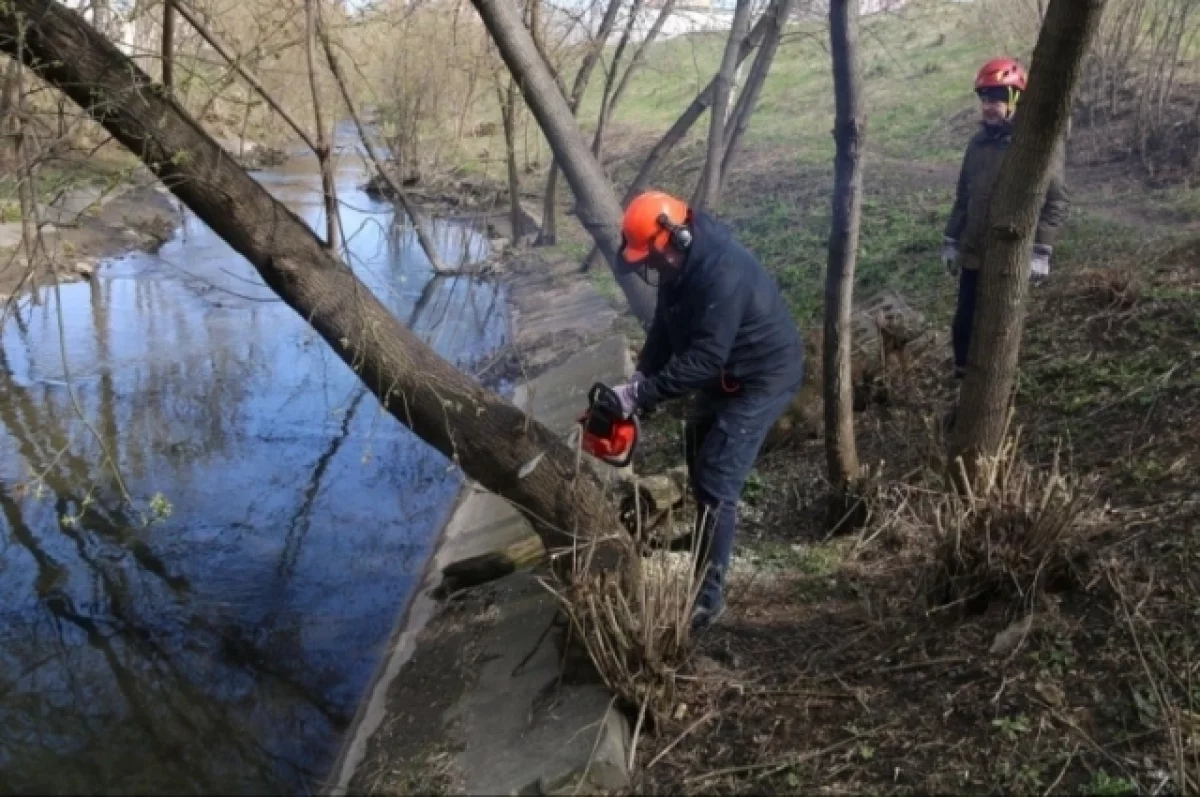 Илья Беспалов занимался уборкой на Новомосковском шоссе, где также происходило благоустройство русла Рогожинского ручья. Глава городской администрации распиливал аварийные деревья.