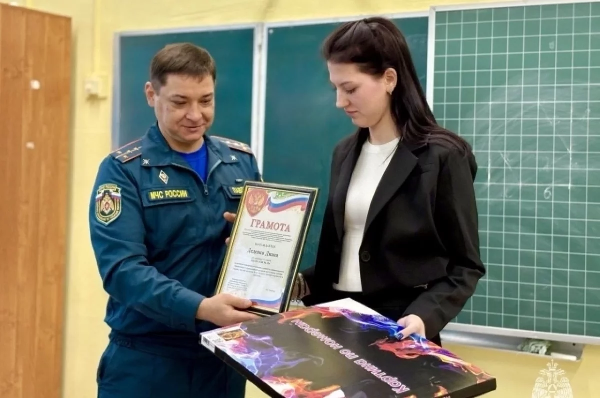 За проявленную храбрость сотрудники государственного пожарного надзора по Ефремовскому, Каменскому и Воловскому районам наградили девушку грамотой и памятным подарком, а также вручили огнетушитель, который поможет в случае возникновения небольшого возгорания.