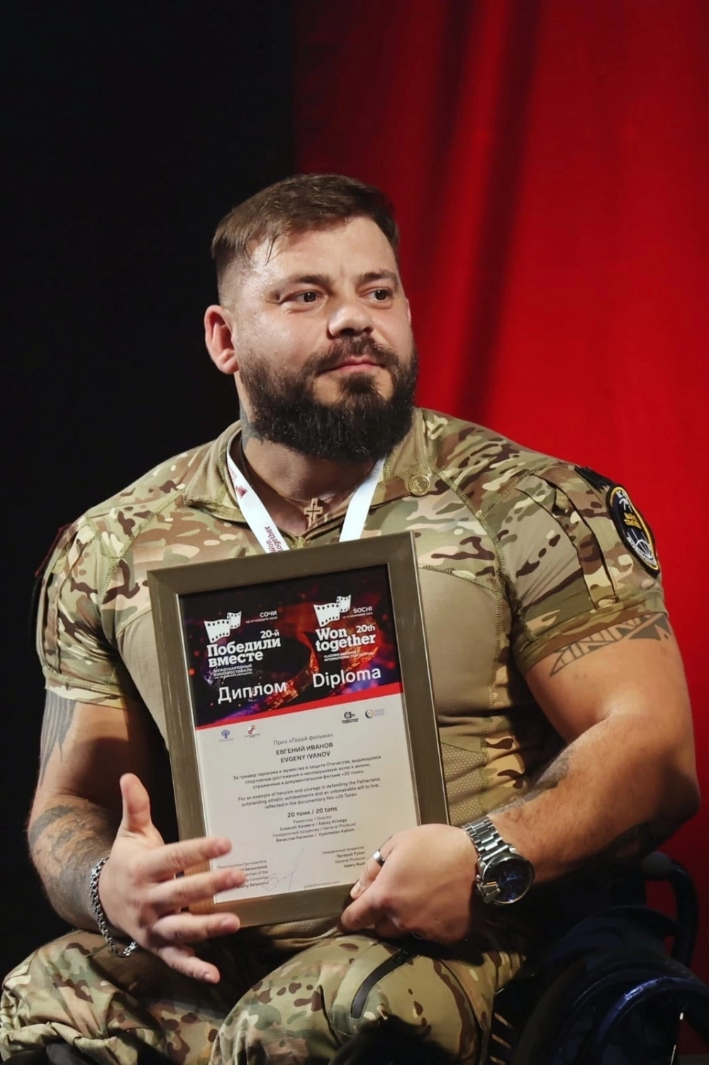 Евгений Иванов: Когда я лежал в госпитале, о моей истории узнал саратовский режиссёр Алексей Кривега. Он решил снять документальный фильм о судьбе человека, который получил ранение и смог встать на ноги. Продюсером фильма стал полковник запаса, депутат Вячеслав Калинин. Назвали его «20 тонн». Сейчас этот фильм стал участником международного кинофестиваля имени режиссёра Владимира Меньшова, который проходил в Сочи. Наш фильм был показан под закрытие первого дня фестиваля. Но вообще до этого мы уже получили награду на кинофестивале в Саратове. Сейчас вот в Сочи в номинации «Лучший герой». Третья награда была в Казани за лучший патриотический фильм. Это уже спустя день или два, мы туда не поехали, потому что в Сочи были. Фильм показывали без нас.