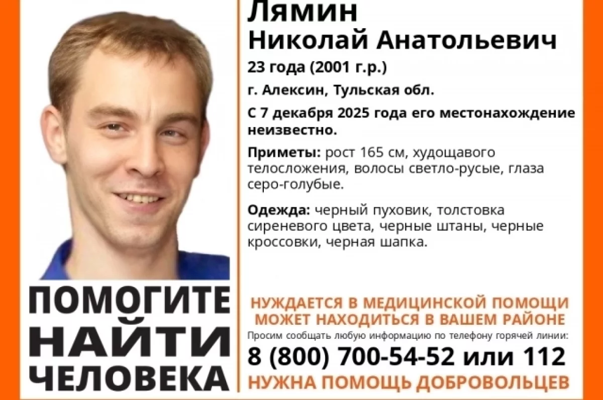Он пропал с 7 декабря. Рост 23-летнего парня составляет 165 сантиметров, телосложение худощавое, волосы светло-русые, глаза серо-голубые. На нём был пуховик чёрного цвета, сиреневая толстовка, чёрные шапка, штаны и кроссовки. Ему может быть нужна помощь медиков.