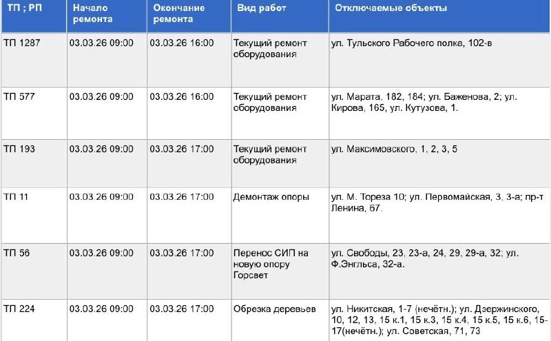 3 марта по ряду адресов Тулы отключат свет. От этом сообщают «Тульские городские электрические сети».