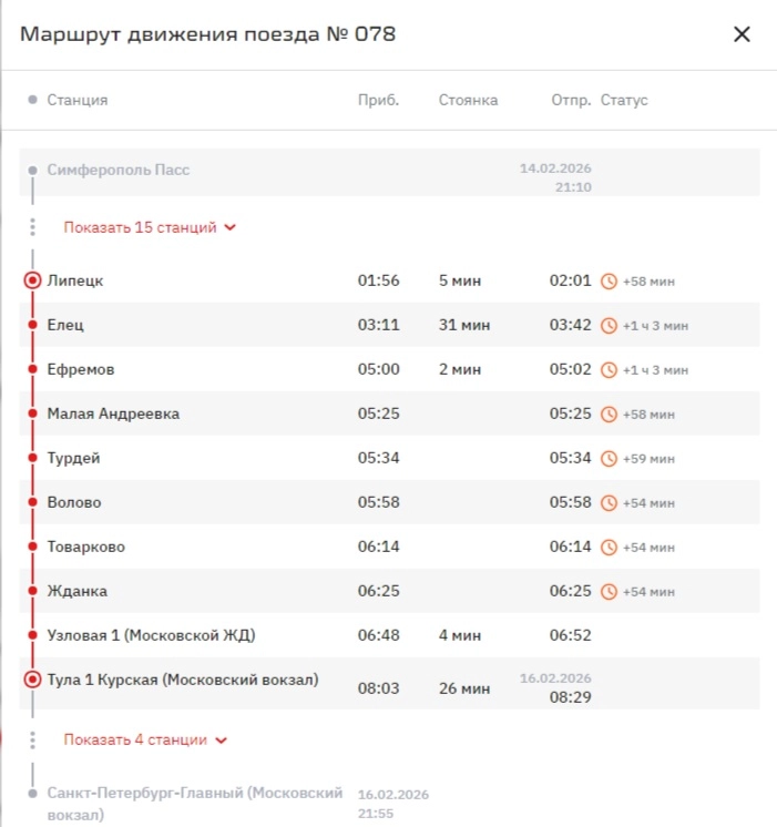 Поезд №78 сообщением Симферополь - Санкт-Петербург, следующий через Ефремов, Узловую и Тулу, опоздал до станций в Тульской области примерно на час. Это следует из данных о фактическом движении поездов на сайте российского железнодорожного монополиста. Причиной стало временное перекрытие Крымского моста в субботу, 14 февраля. Из-за этого на станцию Тамань-Пассажирская состав прибыл с пятичасовой задержкой, но в пути смог частично наверстать опоздание.