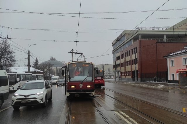 В полдень у перекрёстка улиц Советская и Дзержинского из-за поломки токоприёмника остановился трамвай №13. Из-за этого заблокировано движение электротранспорта в сторону Пролетарского района.