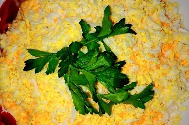 Моем и очищаем морковь, чеснок от шкурки и шелухи, сыр от фольги, отварные яйца от скорлупы. Все ингредиенты натираем на мелкой тёрке, хорошо перемешиваем, чтобы плавленный сыр не остался в салате комочками, далее добавляем майонез, ещё раз перемешиваем до однородной массы. Сверху можно украсить натёртым желтком и зеленью. Такой салат получается очень нежным, вкусным и с остринкой. Его можно положить в большой салатник или разложить по тарталеткам.