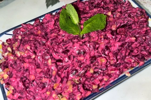 Свёклу отвариваем, даём остыть и очищаем от шкурки, натираем на крупной тёрке, зубчик чеснока на мелкой. Если решили добавить грецкие орехи, то их измельчаем с помощью ножа, надавливая на каждый орех, если кедровые, то добавляем их в целиковом виде. Перемешиваем, кладём майонез и ещё раз смешиваем. Далее перекладываем в салатник. Сверху можно украсить салат листьями зелени или мяты.