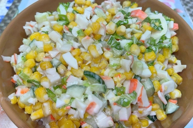 Крабовые палочки, мытый огурец и отварные яйца нарезаем мелкими кубиками, салат листовой промываем под холодной водой и даём полностью обсохнуть, потом шинкуем и добавляем в общую миску, кукурузе даём стечь и смешиваем аккуратно с остальными ингредиентами, добавляем майонез и перемешиваем непосредственно перед тем, как выложить блюдо в салатник и подать на стол.