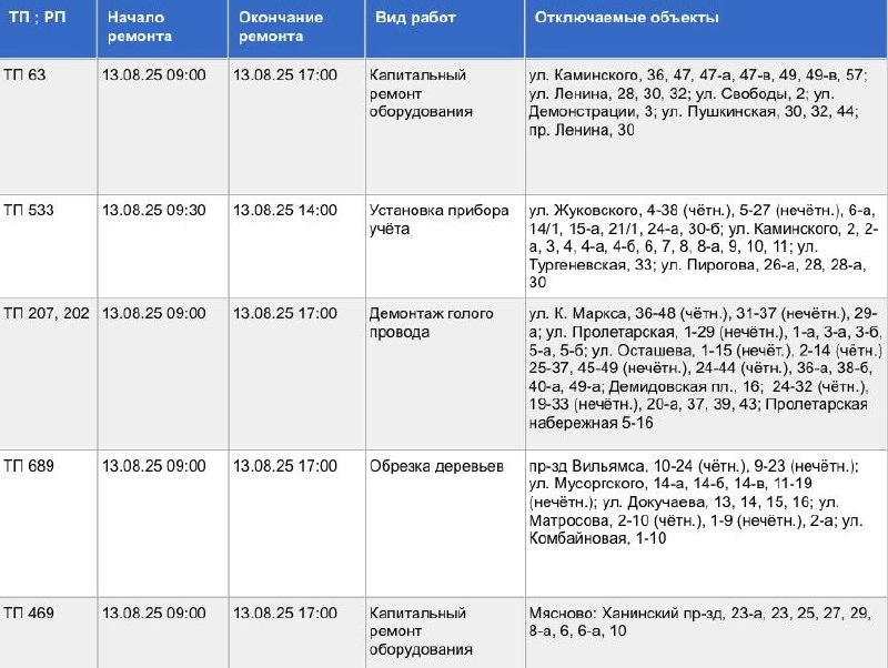 Пройдут работы. Планируется провести обрезку деревьев, капитальный ремонт оборудования, демонтаж голого провода и установку прибора учёта. Света не будет с 09.00 и 09.30 до 17.00 и 14.00, в зависимости от адреса.