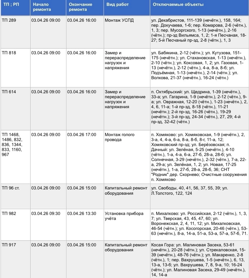 Запланированы работы по капитальному ремонту оборудования, установке прибора учёта, замеру и перераспределению нагрузок и напряжения и др. Отключения начнутся в 09.00 и 09.30, в зависимости от адреса.