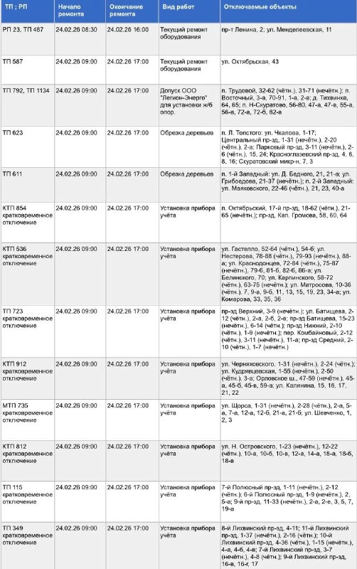 Пройдут работы по установке прибора учёта, текущему ремонту оборудования, обрезке деревьев и др.