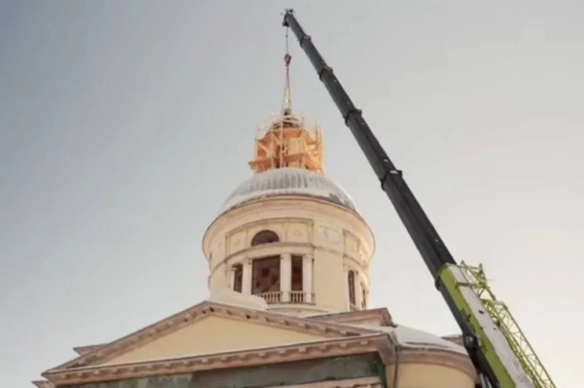 Демонтированы конструкции завершающей части собора, пострадавшей при атаке БПЛА весной прошлого года. После демонтажа главки храма: крест, подкрестное яблоко и каркас купола, проверят на предмет повреждений и необходимых реставрационных работ.