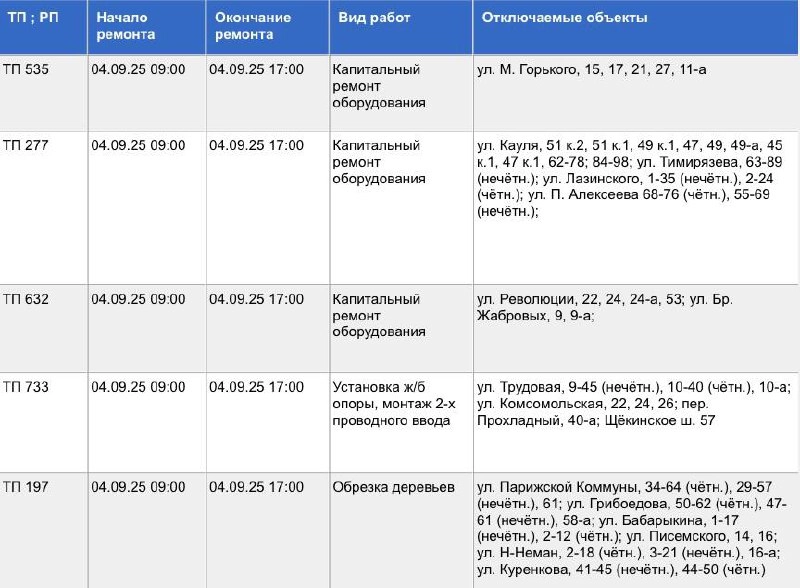 Запланирован капитальный ремонт оборудования, обрезка деревьев, установка опоры и др. Света не будет с 09.00 до 17.00.
