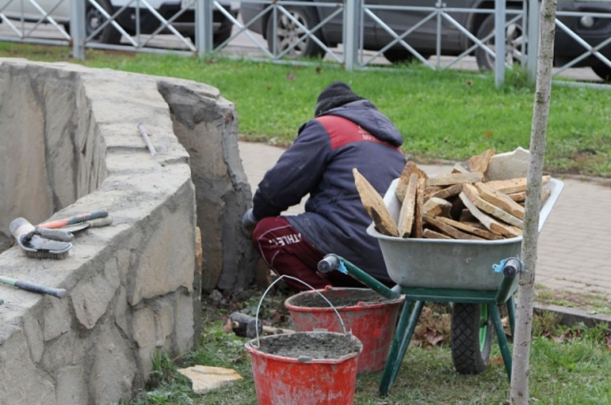 Рабочие меняют фрагменты пришедшего в негодность плиточного покрытия на декоративных подпорных стенах.